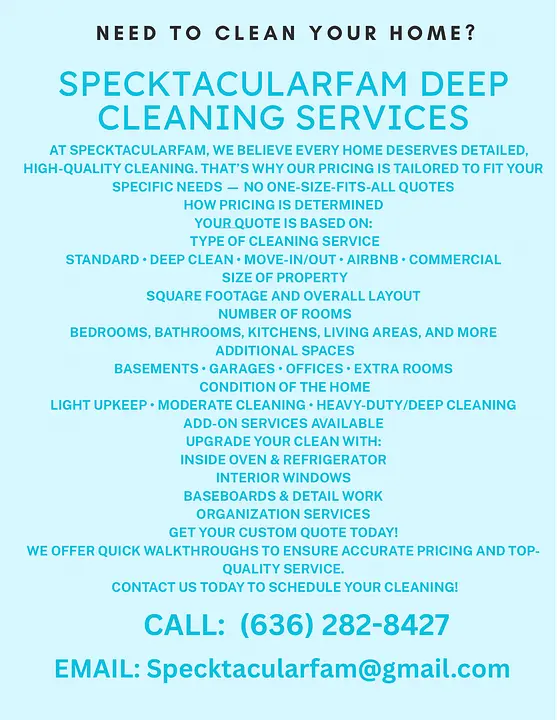At SpecktacularFam, every service is thoughtfully customized. Your investment is based on your home’s size, layout, condition, and the level of detail required. From routine upkeep to intensive deep cleans, we curate each experience to deliver exceptional, specktacular results — with precision, care, and transparency!